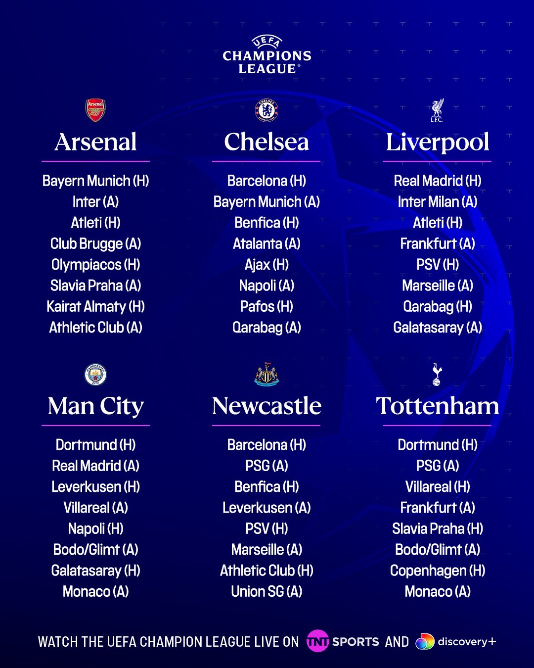 – **Liverpool**: Facing Real Madrid, Juventus, Slavia Prague, and Kairat Almaty.