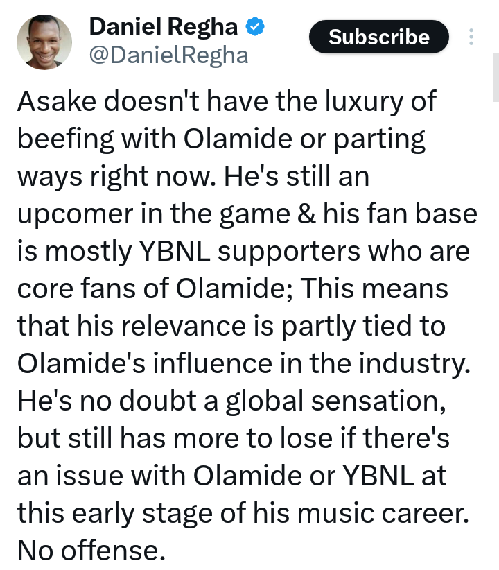 Social media influencer Daniel Regha has cautioned Nigerian singer Asake against engaging in a beef with his former boss Olamide.