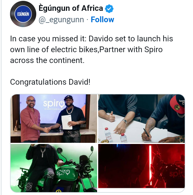 African entertainment Celebrity News Davido electric bikes Spiro sustainable transportation