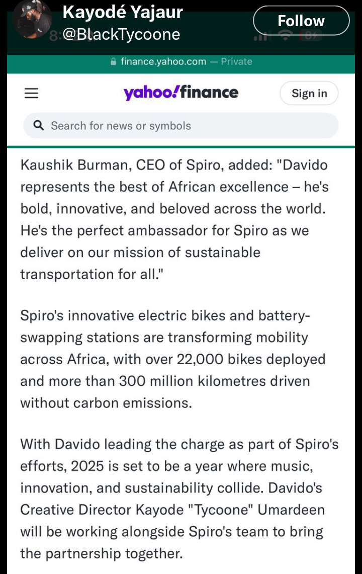 Kaushik Burman, CEO of Spiro, praised Davido as the perfect ambassador for the brand, citing his bold, innovative, and beloved personality. Davido celebrated the news on social media, boasting of creating generational wealth through his various business ventures.