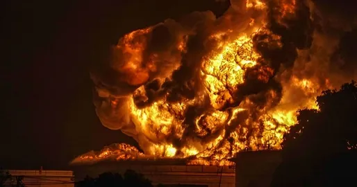 The blaze, which engulfed multiple petrol storage tanks, was reported in the early morning hours.