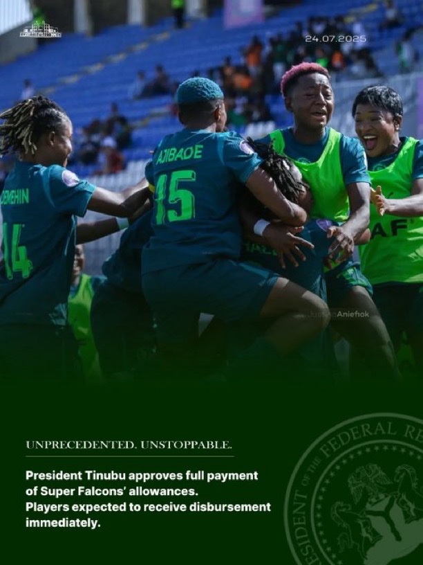 President Bola Tinubu has approved the immediate and full payment of outstanding allowances and match bonuses for Nigeria’s Super Falcons, ensuring the team is financially supported ahead of their Women’s Africa Cup of Nations (WAFCON) final against Morocco on Saturday, 26 July 2025. The announcement, made on Thursday evening, has been met with widespread approval as players, coaches, and team officials are expected to receive their disbursements by the close of business on Friday.